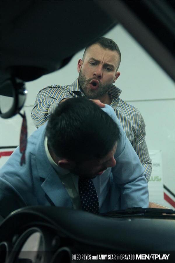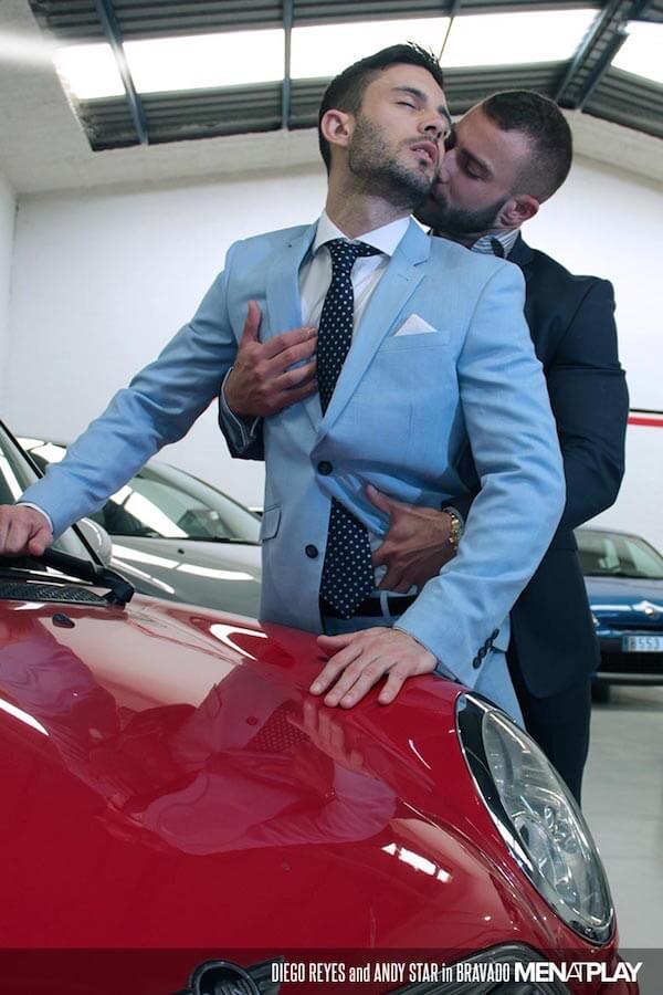 Plan cul gay en costume cravate entre un garagiste gay et son client : vous aimez ?