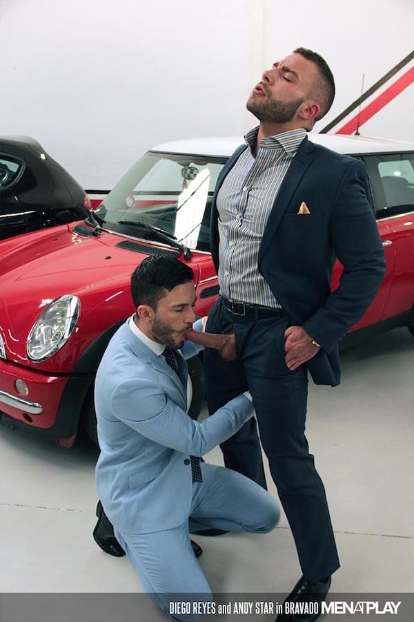 Heureusement que le concessionnaire est arrangeant et veut garder son client ! Il lui propose de lui tailler une pipe dans la concession automobile, en costume cravate entre hommes.